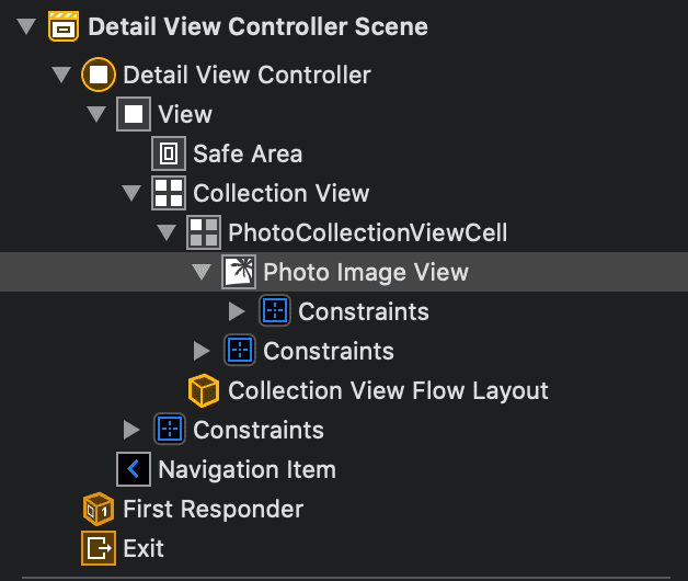 CollectionViewCell を作成するとデフォルト状態で、CollectionViewCell の中に ContentView が作成されます。 この上に画像を配置すると、 CollectionViewCell > ContentView > ImageView のような形になります。